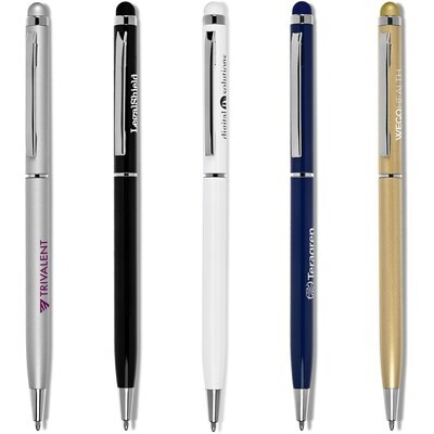 This metal ball pen is fitted with a stylus for use on mobile devices. The matte barrel has a soft touch feel, and laser engraving produces precise and clear logo branding.